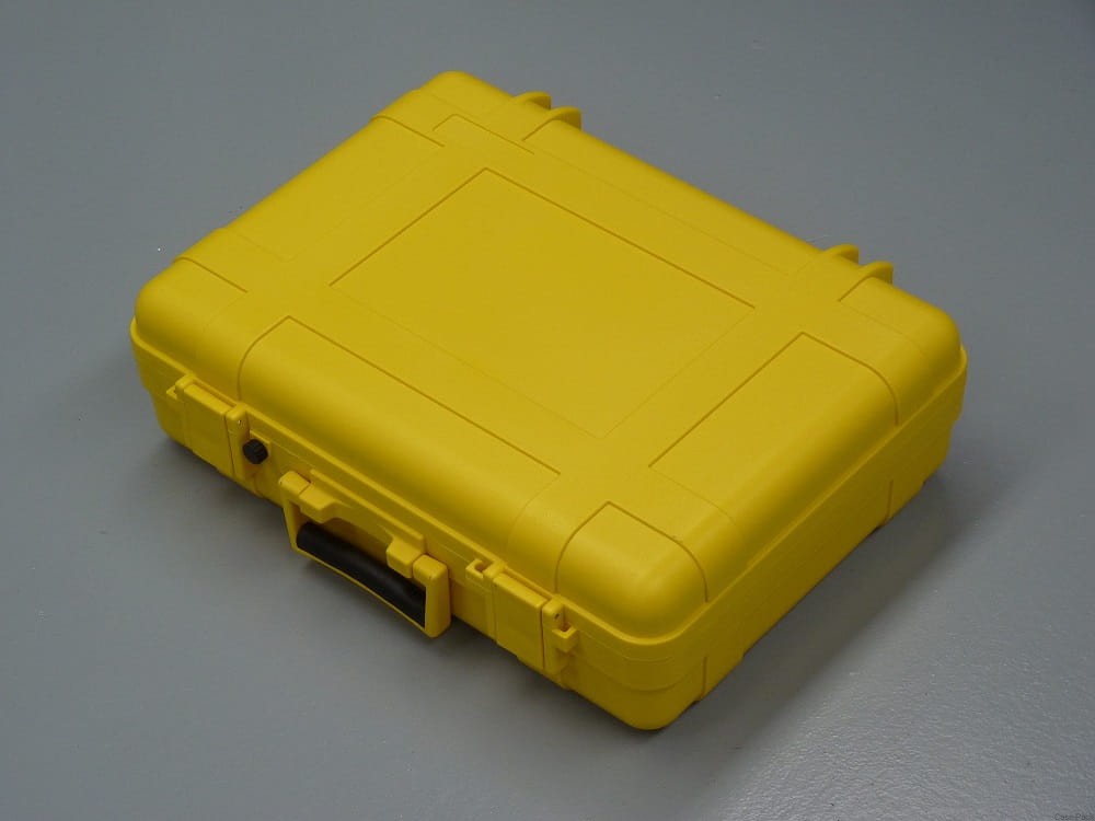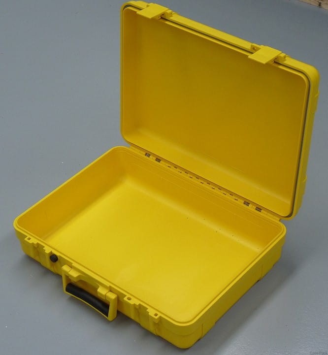 Skrzynia z tworzywa sztucznego (mieszanka ABS i poliwęglanów) wodoszczelna i pyłoszczelna. Wyposażona w silikonową uszczelkę wokół pokrywy oraz automatyczny zawór spustowy ciśnienia. Odporna na wstrząsy i uderzenia. Wygodny uchwyt. Skrzynia posiada system sztaplujący, który umożliwia bezpieczne układanie skrzyń jedna na drugiej. Zawias na całej długości dekla. Możliwość założenia kłódki lub plomby.
