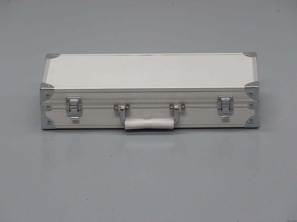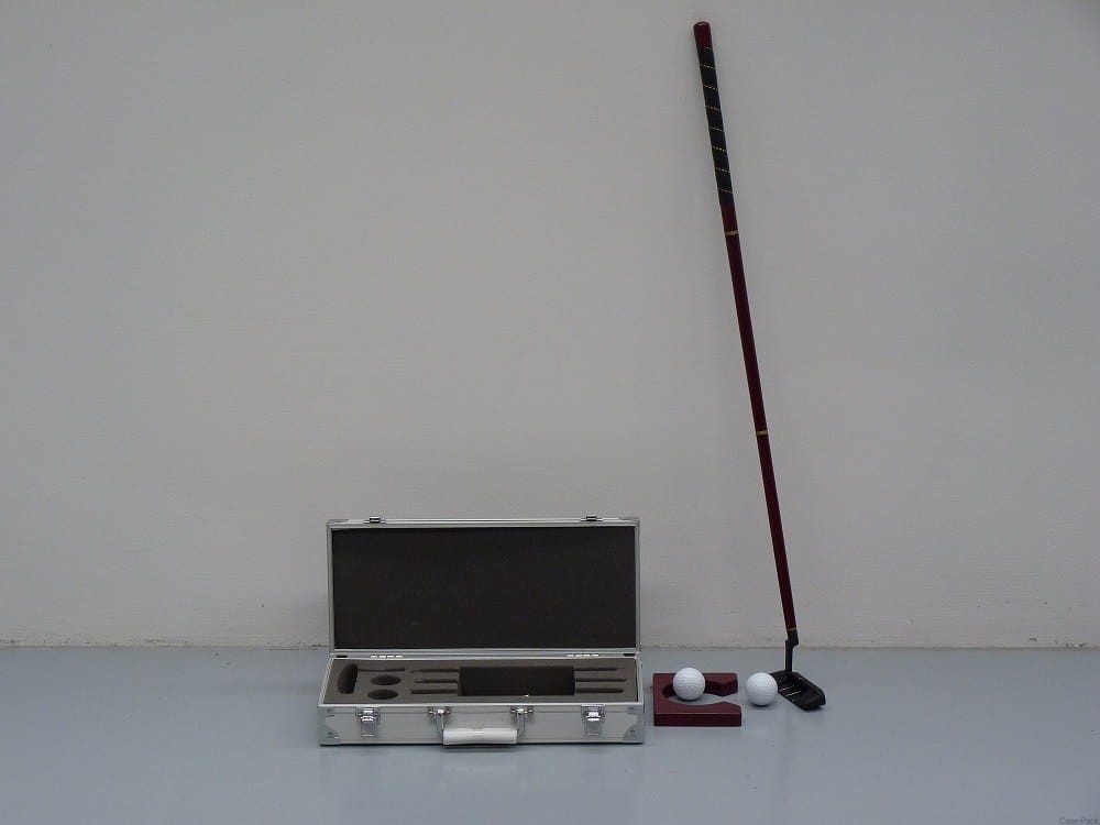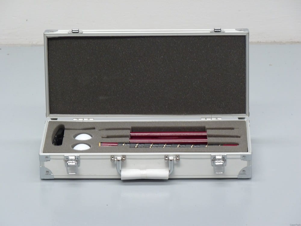 Skrzynia transportowa wraz z składanym kijem do golfa, dwiema piłeczkami oraz dołkiem.